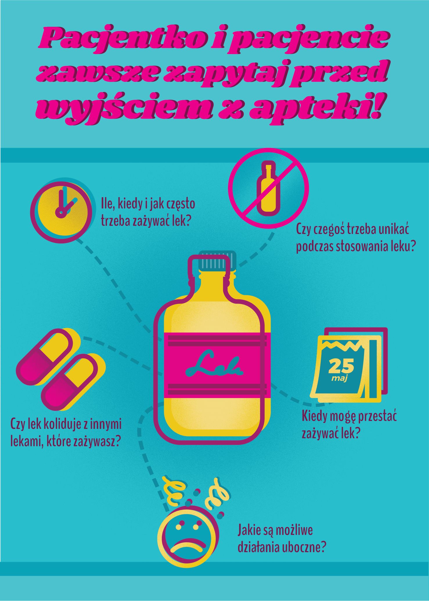 - Informacja / zwiększanie wiedzy pacjenta o leku i działaniach niepożądanych (okazuje się bowiem, że duża ilość działań niepożądanych w ulotce prowadzi do zaprzestania brania leku)